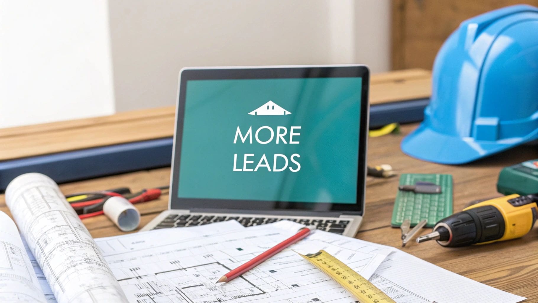 A hand holds a smartphone displaying "GET CALLS NOW" amidst various contractor tools on a wooden desk.